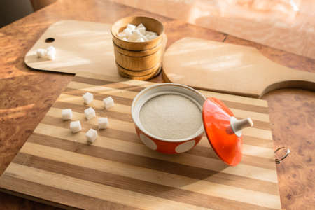 Sugar and refined sugar are poured into the sugar bowl on the table.