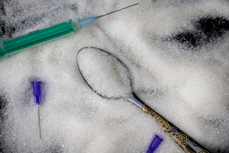 Medical needles, syringe and sugar on a black background. The concept of the harmful effects of granulated sugar on the human body and dependence on sweets.