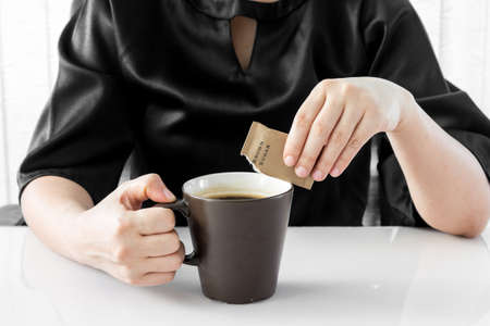 Woman chooses brown sugar puts in the coffee