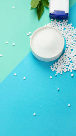 Sugar substitute on color background. Diabetic concept. Top view, flat lay, copy space