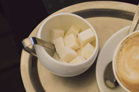 Close up photo of coffee cup and dropping sugars. concept of diabetes and overuse of sugar.