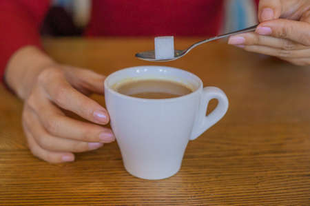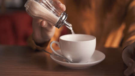 Diabetes, overuse of sugar and unhealthy sweets for mug of tea, coffee or hot drink at home. Closeup of woman making, drinking and preparing beverage with teaspoon of substitute, glucose or stevia