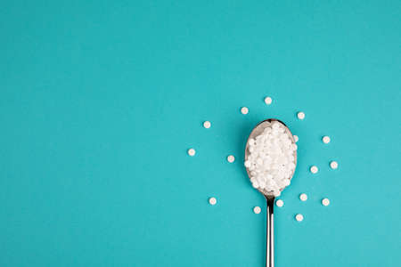 Sugar substitute pills in a spoon, on a blue background.