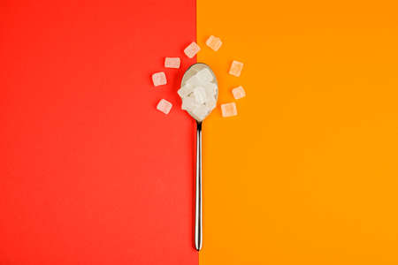 Sugar-replacing tablets spoon on orange and red background.