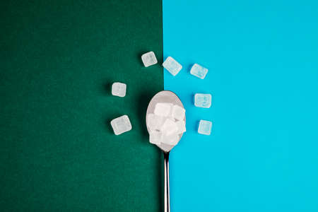 Close-up of a spoon with sugar heap, crystals of white sugar on blue background, top view