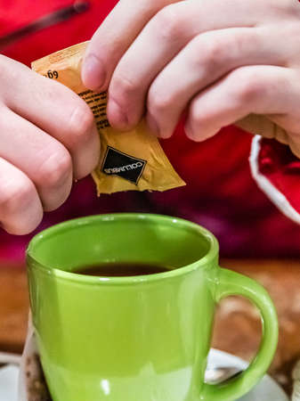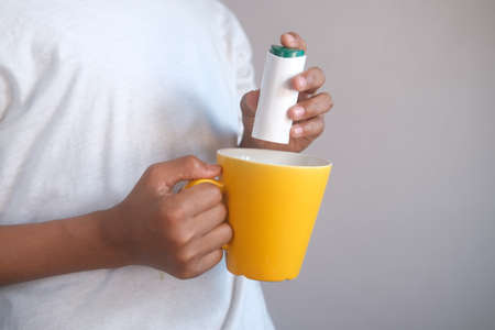 young man putting artificial sweetener in tea,