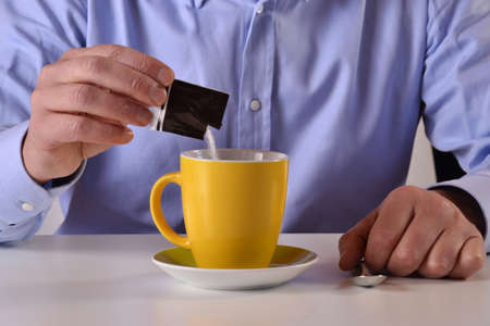 Business man pouring sugar bag on yellow coffee cup
