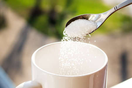 Hand pouring granulated sugar from a spoon into a cup of coffee in a cafe, promoting a low sugar lifestyle and highlighting the potential dangers of excessive sugar consumption