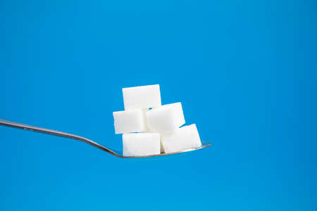 Sugar cubes on blue background. Granulated sugar is unhealthy food.