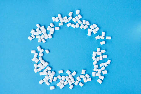 small white marshmallows scattered on a blue background copy space, circle of marshmallows top view mock up