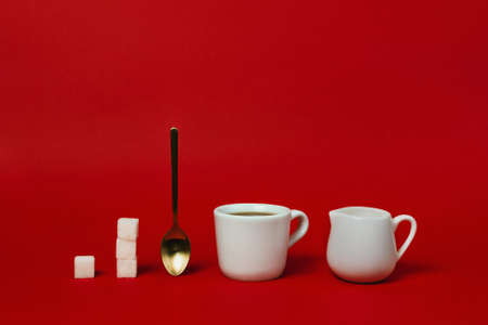 Cup of americano, golden spoon, creamer and sugars cups on red