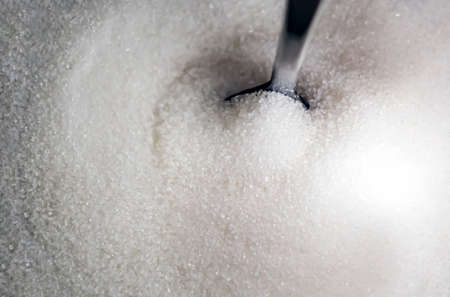 A teaspoon dipped in white sugar. Sweet food and ingredient.
