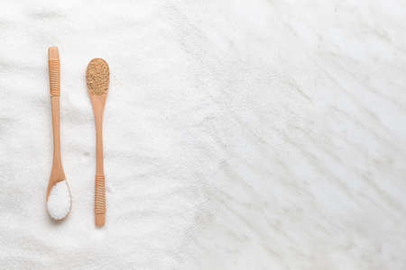 Spoons with sugar on light background