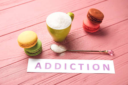Word ADDICTION, cup with sugar and cakes on color wooden background