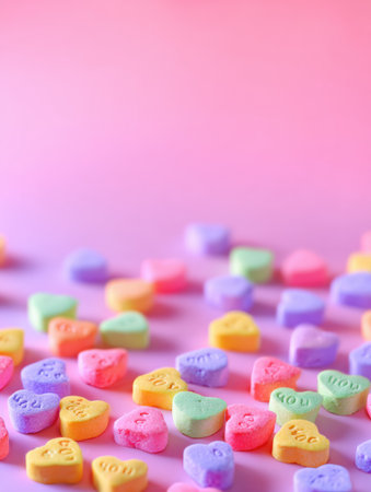Candy hearts in various colors are scattered across a smooth surface, creating a cheerful and soft pastel atmosphere perfect for any festive occasion.