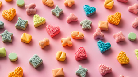 Colorful candy scattered on a pink background, showcasing a variety of shapes and textures during a vibrant celebration