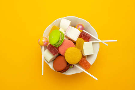 colorful sweets of sugar candies and marmalade in a white bowl on a bright yellow background