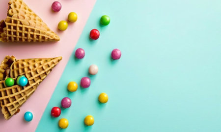 Banner of Ice cream waffles cones with colorful candy, sweets, jelly scattering of multicolored sweets on pink background. Flat lay, Top view. Copy space.