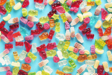 Rainbow juicy gummy candies background. top view. Jelly sweets.