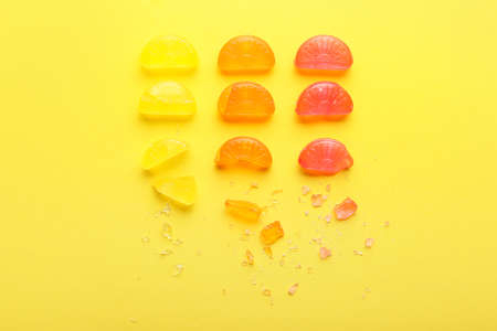 candies with jelly and sugar. colorful array of different childs sweets and treats on yellow background. red marmalade in the shape of a heart with a variety of caramels and candies, marshmallows. Abstract. top view copy space.