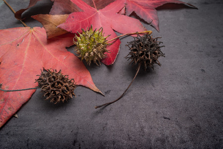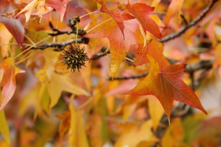 Close up of sweetgum autumn leaves and spiky green seed ball. American storax