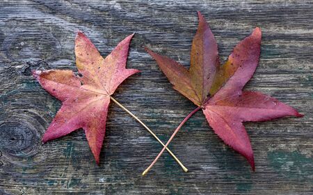 Two rotten Sweetgum leaves on the weathered wood as an autumn bakground