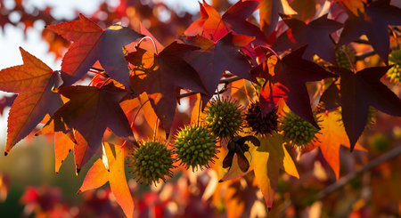 Sweetgum, sweetgum tree or copalm balsam with fall foliage and seeds, altingiaceae