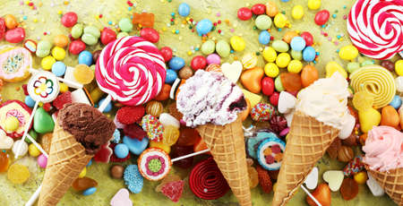 candies with jelly and sugar. colorful array of different childs sweets and treats