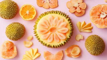 This vibrant image showcases an artistic arrangement of various tropical fruits including durian, orange, and mango, set against a soft pink background.
