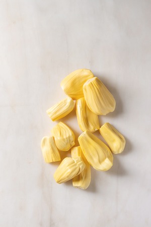 Ripe raw peeled jackfruit over white marble background. Flat lay, space