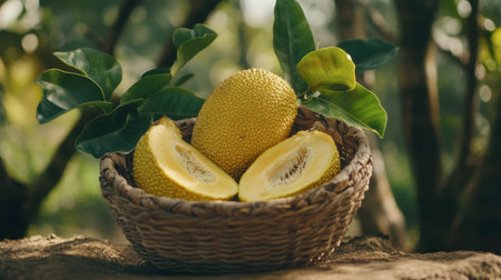 A fresh jackfruit pod displayed in a small basket, with hints of greenery in the background.
