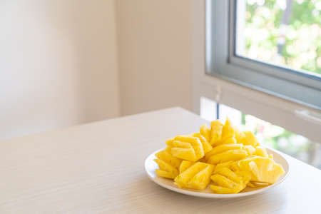 fresh pineapple sliced on white plate