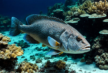 Malabar grouper swimming in tropical underwaters. Grouper in underwater world. Observation of animal world. Scuba diving adventure in South Africa coast of RSA