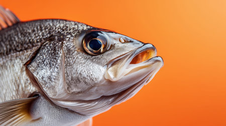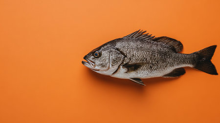 This image showcases a freshly caught fish displayed on a vibrant orange background, highlighting the intricate details of its fins and body texture. Perfect for illustrating seafood themes.
