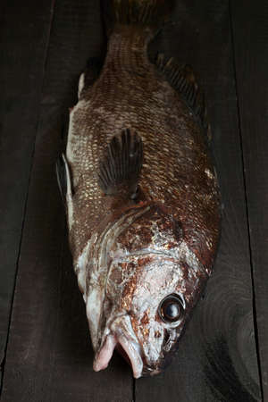 Sciaena umbra on black wooden background at the kitchen