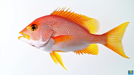 vibrant Vermilion Snapper displays its striking red and yellow hues against a crisp white backdrop highlighting its unique features and beauty.