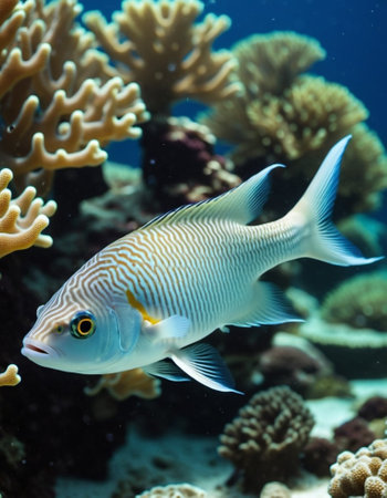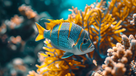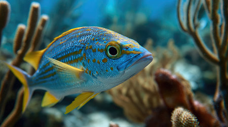 A colorful fish swims gracefully in a marine setting, surrounded by coral formations. The image showcases the fish's bright blue and yellow coloration against a blurred underwater background. Soft lighting enhances the textures of the coral. Suitable for educational materials, environmental publications, or decorative purposes.