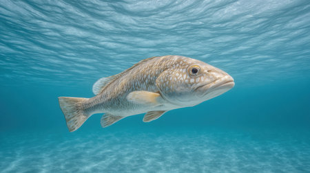 A stunning underwater photograph capturing a fish swimming effortlessly in clear blue ocean water, showcasing the beauty of marine life and the tranquility of aquatic environments.