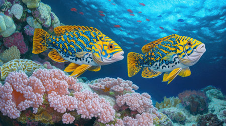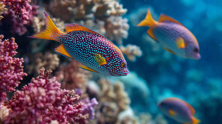 A pair of tropical fish gracefully swim in the vibrant coral reef at the bottom of the sea.