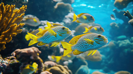 A group of fish swim through the ocean water with details in a close up shot. The image shows a fish with yellow fins with the other in the background. Coral can be seen along the left side. The lighting is diffused, suggesting a submerged environment with a naturalistic aesthetic suitable for various applications.