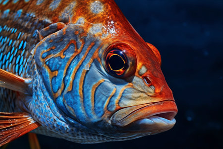 Cichlid fish isolated on a dark blue background, close-up