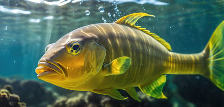 A detailed view of a tropical fish swimming in the sea, with a blurred coral reef background.