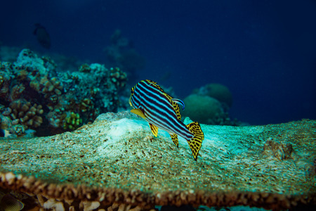 Plectorhinchus vittatus or the yellow indian ocean oriental sweetlips fish in colorful underwater coral reef. marine animal wildlife ocean sea background