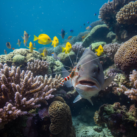 Vibrant coral reef with a large fish and cleaning shrimp