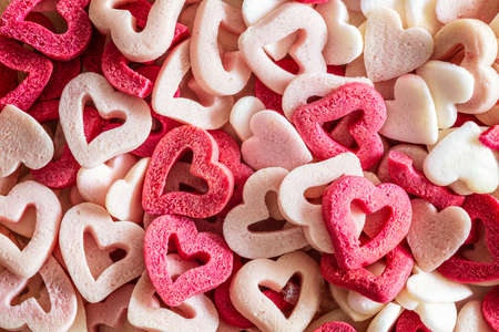 Heap of colorful candies confetti of heart shape, abstract background, Valentine Day holiday concept, macro photograph, horizontal