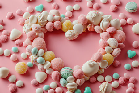 Colorful assortment of candies arranged in the shape of a heart on a white background, showcasing vibrant hues and varied textures in an overhead shot for a general or commercial use. The heart-shaped design is outlined with various candies, including round, gummy, and hard candies, in bright colors like red, orange, yellow, green, and blue.