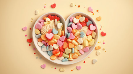 Colorful heart shaped candies in a bowl on beige background, Generative AI