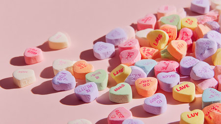 A collection of colorful conversation hearts candies with various messages on a white background. Clear details and vibrant colors enhance visual appeal. resolution use.