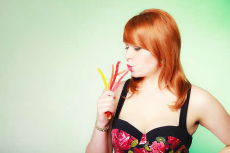 Sexy young woman holding candy. Redhair cute girl with sweet jelly on green.