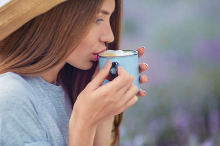 Side close up view of young girl wearing straw hat enjoying hot drink outdoors. Stunning woman drinking coffee with foam, posing in lavender field. Concept of beauty, nature, drink.